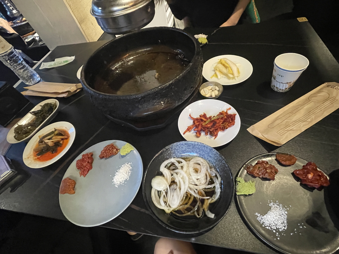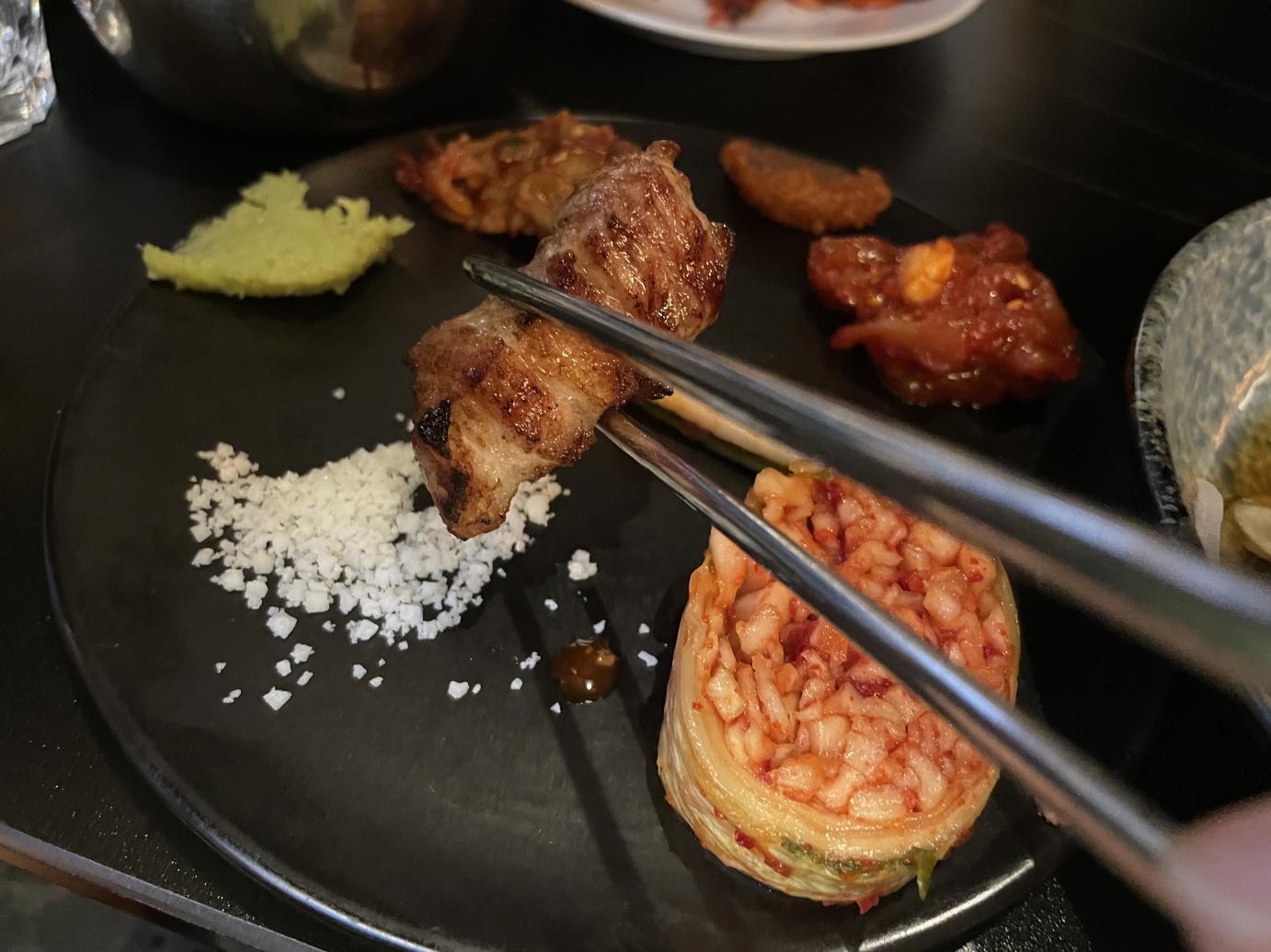 기본반찬은 이렇게 나오고요. 소금과 와사비 등 고기와 함께 곁들여 먹는 반찬이 있는데 조개젓도 있네요. 조개젓은 A형간염, 노로바이러스 등 면역이 약한 분들은 조심해서 먹어야 합니다.
