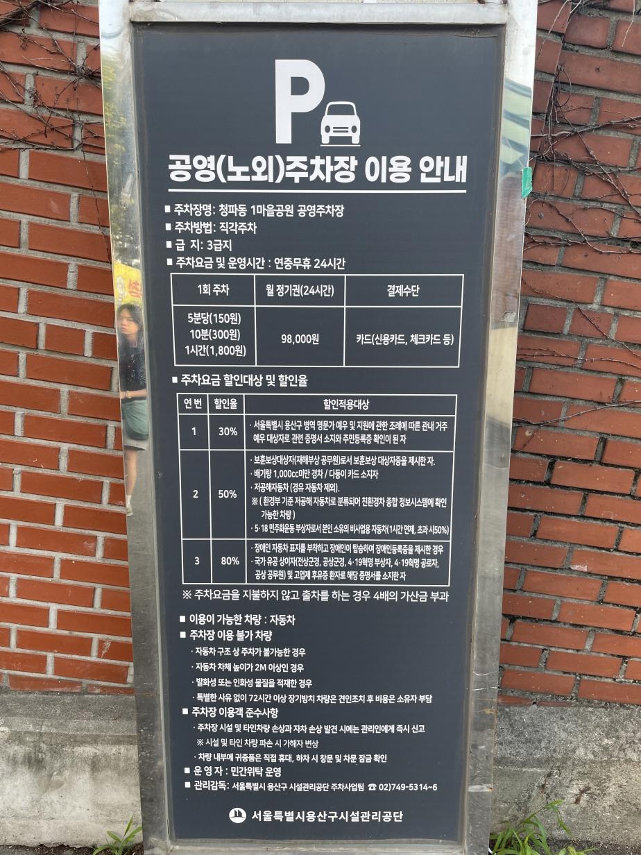 남영돈은 주차장이 없어요. 그래서 근처 유료주차장이나 공영주차장에 주차를 해야 하는데요. 가까운 곳에는 거주자우선 주차장과 유료주차장이 있는데 거주자우선주차장은 주차하면 안 되고, 유료주차장은 주차요금이 비싸요. 남영돈은 웨이팅이 기본 1시간~2시간이기 때문에 유료주차장에 주차하기도 부담이 상당히 많이 되는데요. 이 골목은 주차단속도 많이 하기 때문에 아무 데나 주차해도 큰일 나요. 고기 먹으러 갔다가 불법주차, 또는 주차요금 폭탄을 맞기 쉬워요. 그래서 근처 유료주차장 중 가장 저렴한 주차장과 더 저렴한 공영주차장을 알려드리겠습니다.