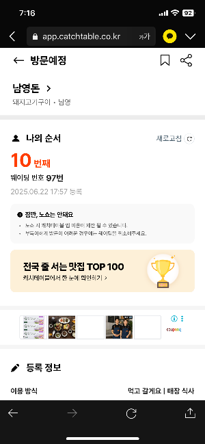 아래 캐치테이블 어플화면을 보시면 오후 6시쯤 웨이팅 등록을 하고 7시40분정도에 3번째 대기입니다. 그러니까 1시간 40분정도 기다린거네요. 참고하세요.
