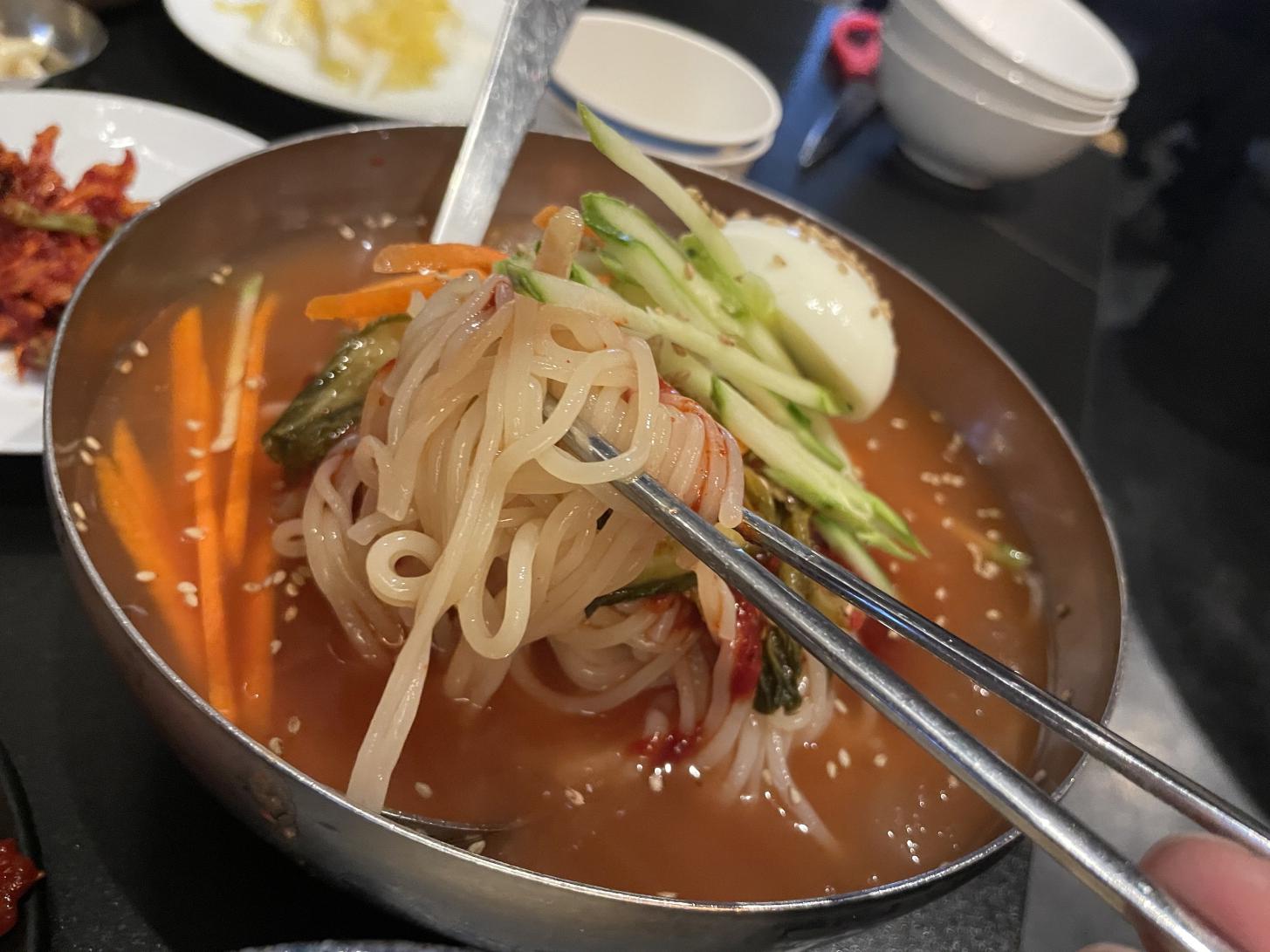 삼겹살을 다 먹으니 조금 아쉬워서 고소한 항정살과 시원한 냉쫄면도 먹었네요. 고기 먹으면서 곁들임 메뉴로 좋네요.