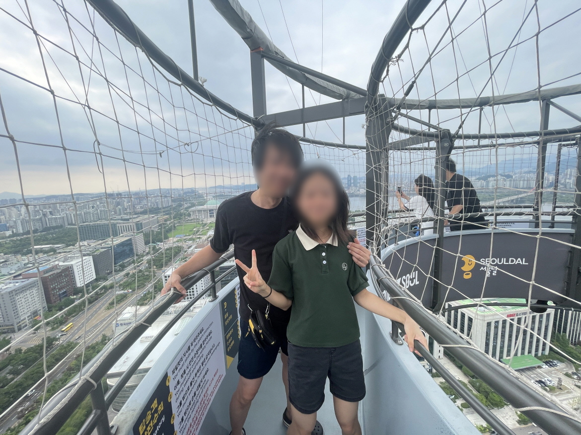 서울달의 비행높이는 130m입니다. 개인마다 느끼는 높이는 다르지만 고소공포증이 있다면 조심해야 하고요. 40층 건물 옥상에서 내려다보는 높이와 비슷해요. 아이들도 타고, 재미있다고 할 정도입니다. 무섭다고 생각하면 무섭고, ‘별거 아니야’라고 생각하면 재미있습니다. 생각하기 나름이에요. 45층 고층아파트 살면서 이거 타면 무섭다고 하는 사람도 있거든요. 대략 옆에 보이는 한화손해보험 건물 높이와 비슷하다고 생각하면 됩니다.