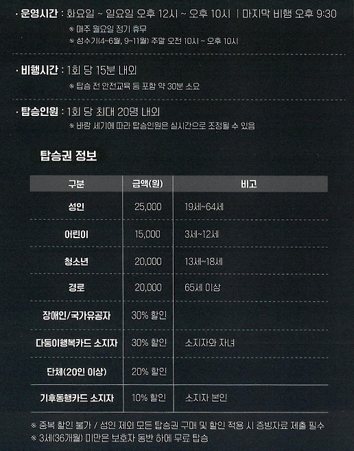 탑승요금: 성인-25,000원, 어린이-15,000원, 청소년- 20,000원