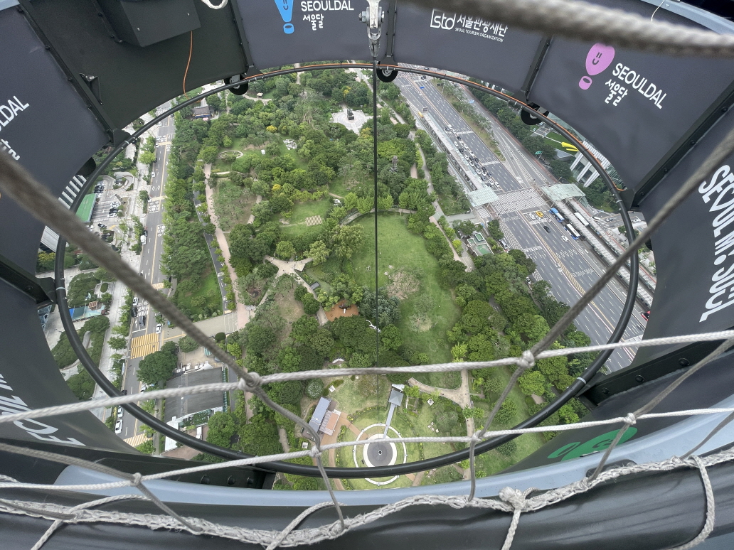 서울달의 비행높이는 130m입니다. 개인마다 느끼는 높이는 다르지만 고소공포증이 있다면 조심해야 하고요. 40층 건물 옥상에서 내려다보는 높이와 비슷해요. 아이들도 타고, 재미있다고 할 정도입니다. 무섭다고 생각하면 무섭고, ‘별거 아니야’라고 생각하면 재미있습니다. 생각하기 나름이에요. 45층 고층아파트 살면서 이거 타면 무섭다고 하는 사람도 있거든요. 대략 옆에 보이는 한화손해보험 건물 높이와 비슷하다고 생각하면 됩니다.