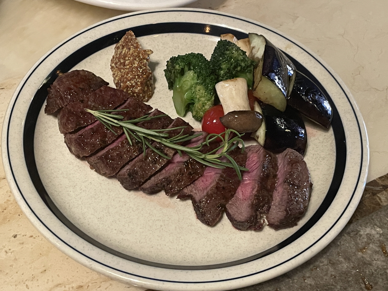 220g 두툼한 고기에 구운 가지, 브로콜리, 새송이버섯 등이 곁들여져 나와요. 겉은 바삭하고 속은 촉촉한 미디엄 레어로 구워져서 육즙이 가득했어요. 겨자소스와 함께 먹으면 느끼함 없이 즐길 수 있답니다.