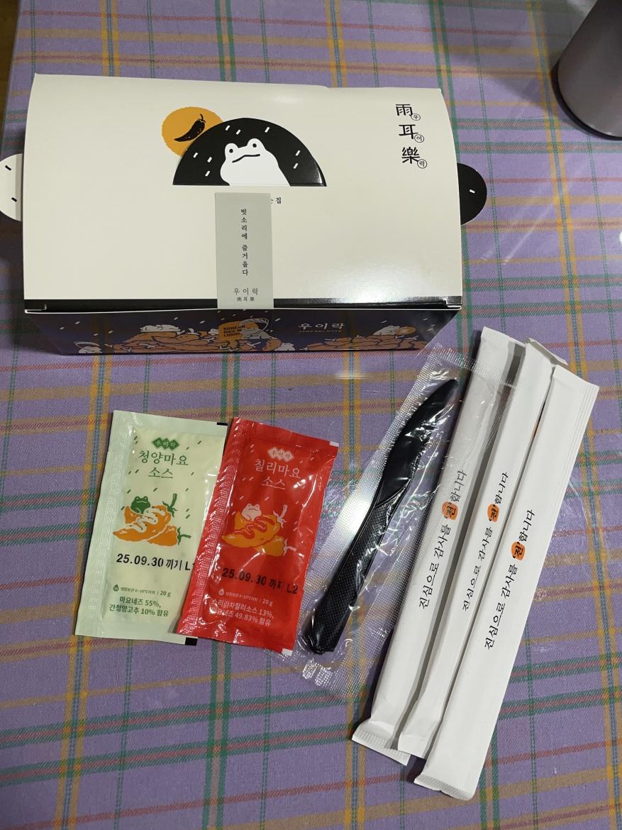 일회용 젓가락, 나이프, 그리고 청양마요 소스와 칠리마요 소스까지 함께 제공돼요.