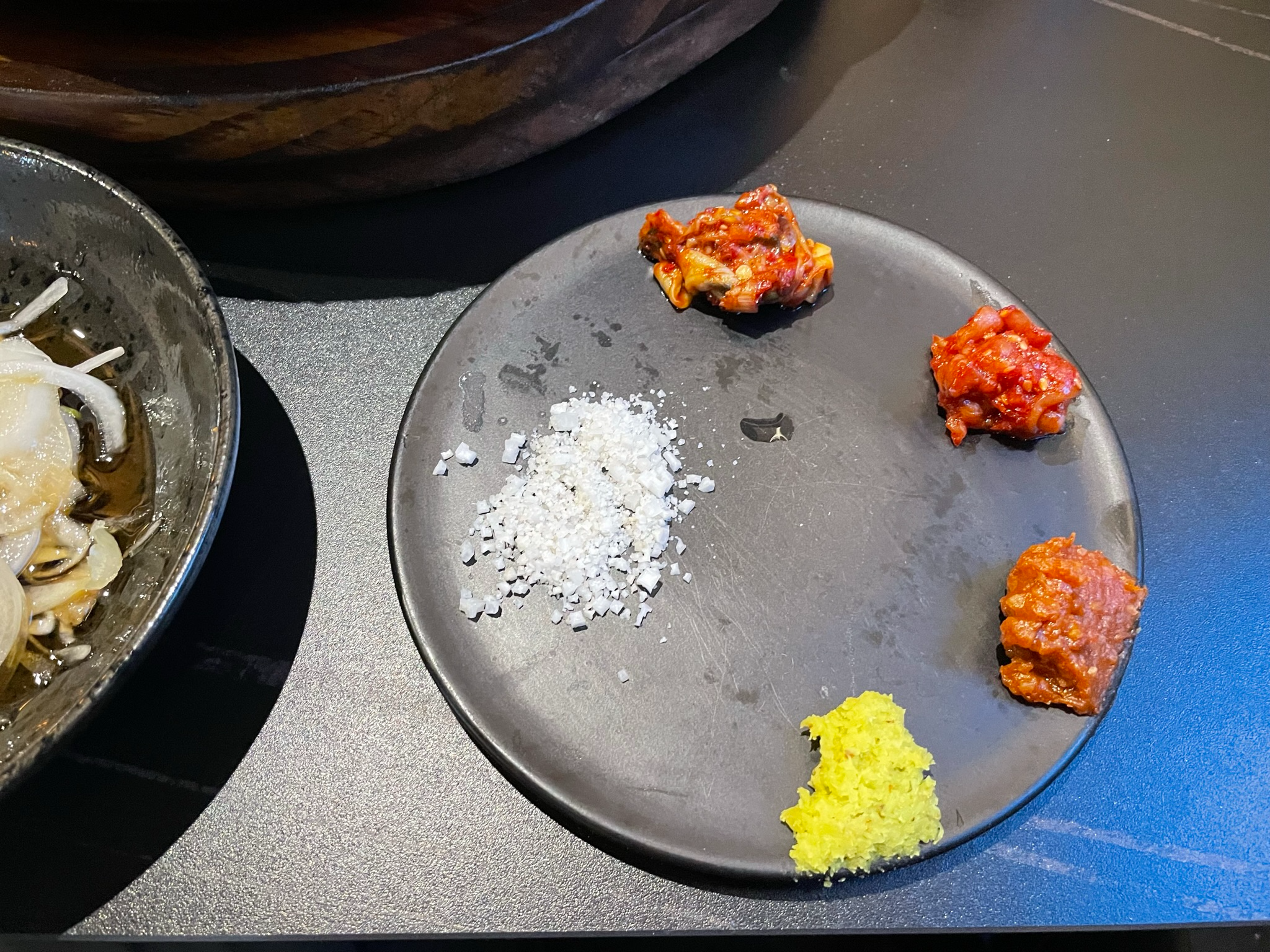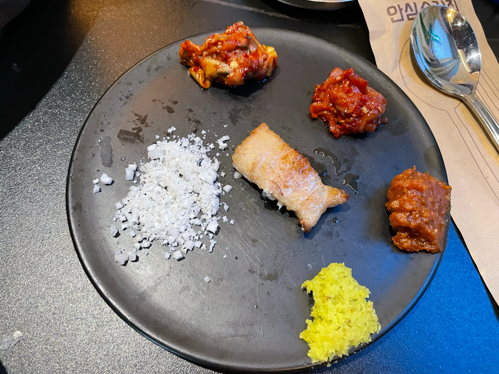 육즙 가득한 돼지고기라서 저는 소금만 찍어 먹는게 제일 맛있었어요.
