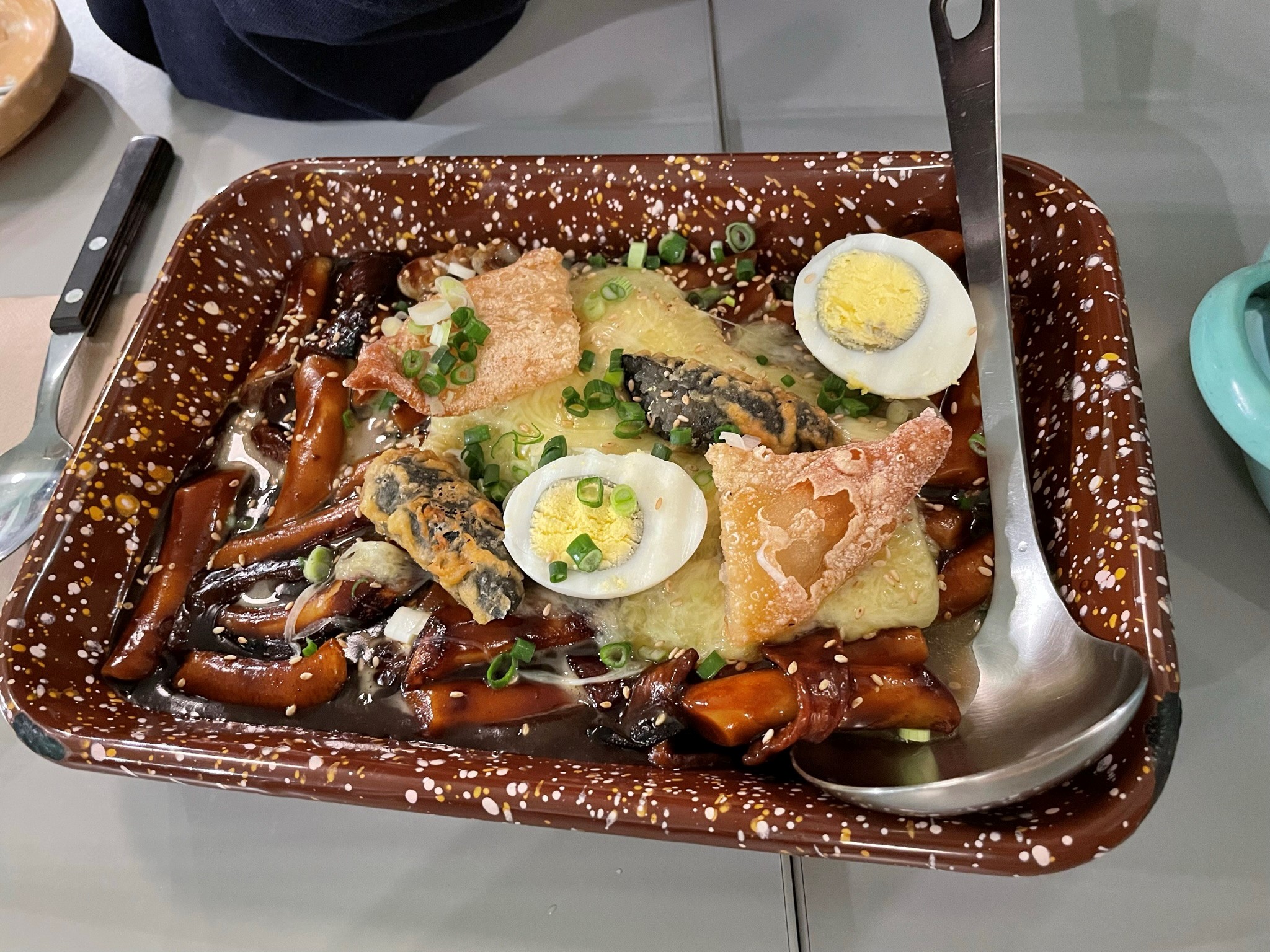 위에 치즈가 뿌려져 있어서 식기 전에 먹어야 해요. (식으면 치즈가 굳어요)
