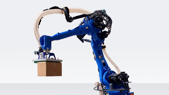 주변 환경을 인식할 수 있는 센서와 카메라를 이용해 상자를 식별하고 크고 긴 팔을 이용해 상자를 들어 컨베이어에 올려놓는 동작을 합니다.