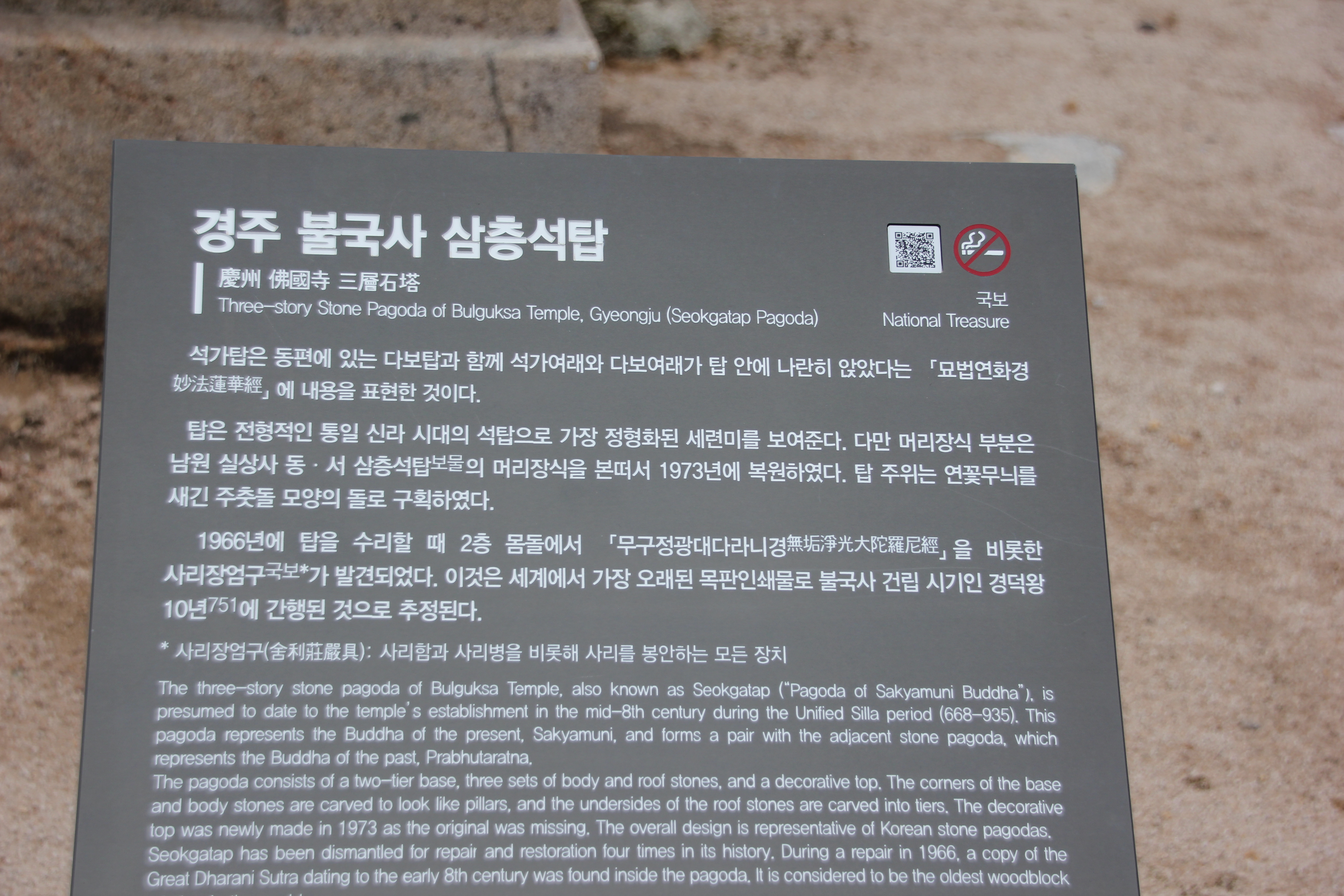 석가탑은 1966년 도굴꾼들에 의해 탑이 손상되며, 부처님의 사리(유골)를 모시는 사각형의 공간에서 사리용기들과 유물들이 발견됩니다. 그중에 ‘무구정광대다라니경’(길이 6m, 폭 8Cm)을 발견합니다. 이것은 세계에서 가장 오래된 목판 인쇄물로 평가됩니다.