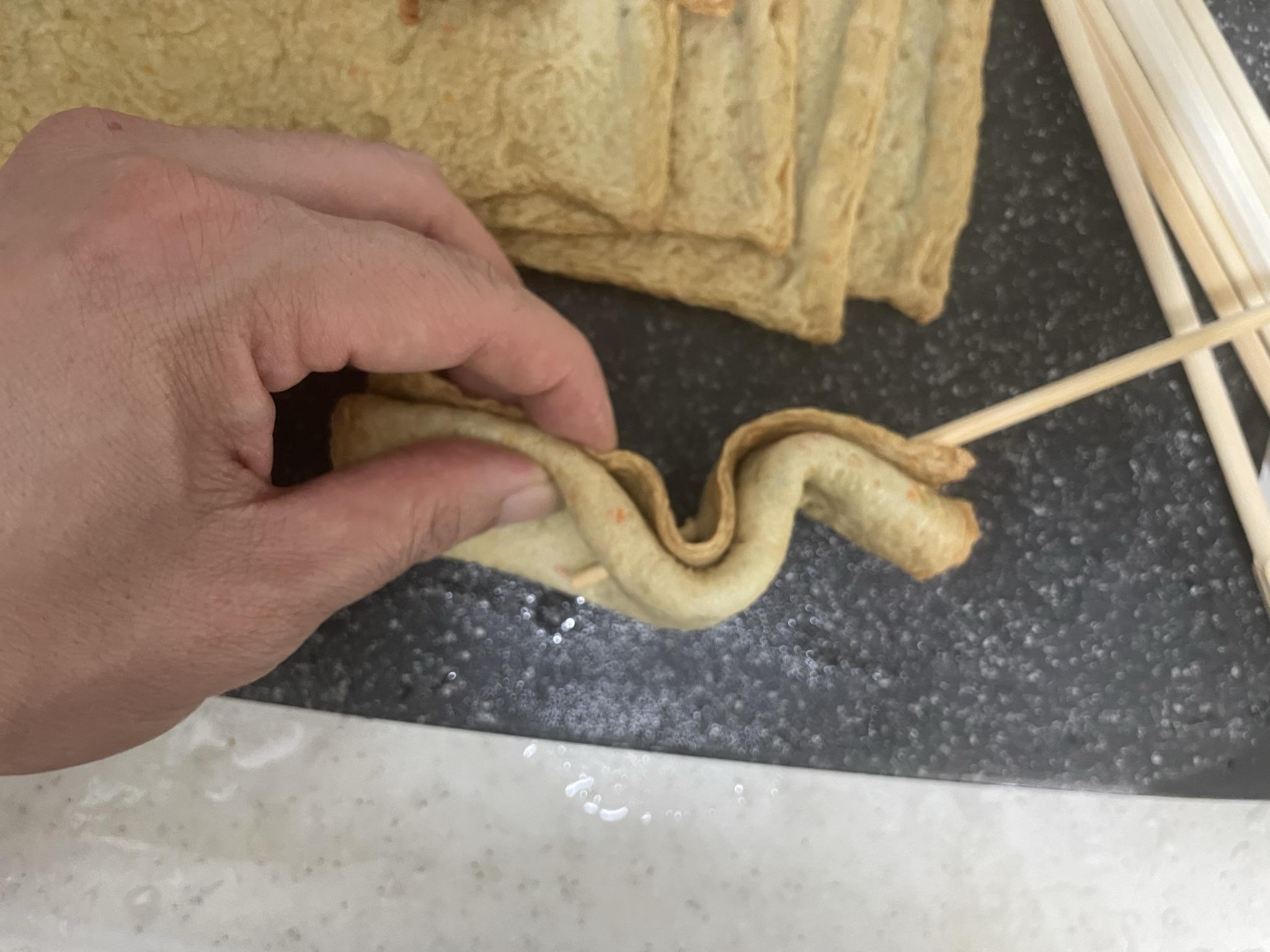 3. 나무젓가락으로 4번 정도 꼬불꼬불하게 꽂아줍니다. 꽈배기처럼 꼬면서 꽂아도 재미있어요.
