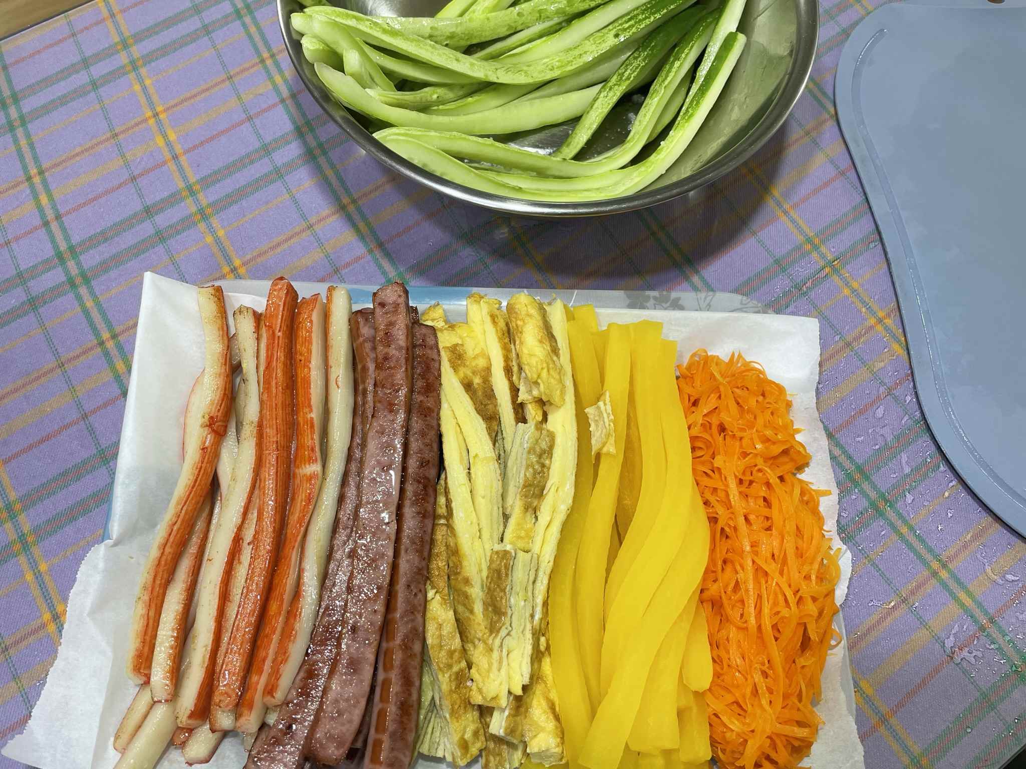 속 재료- 햄, 단무지, 맛살, 당근, 오이, 계란