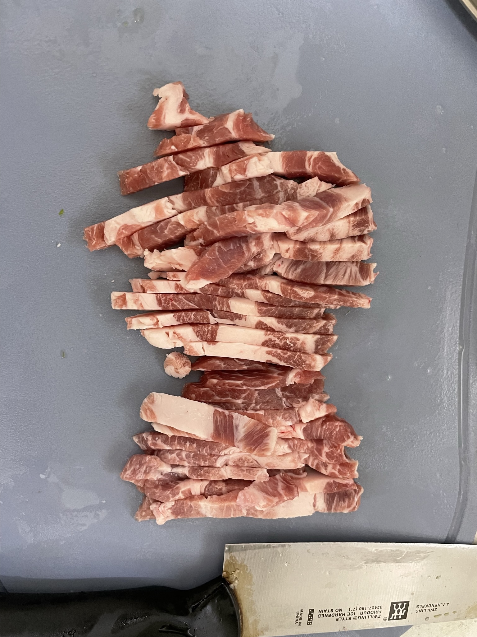 1. 호박, 양파, 돼지고기를 채 썰어 준비합니다. 너무 얇게 채 썰지 않고 적당한 두께로(두께 1Cm 정도) 준비합니다.