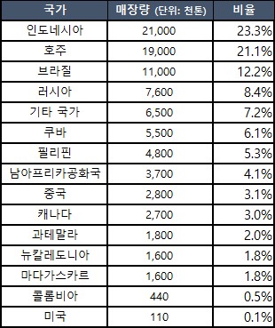 인도네시아와 호주에 20% 넘는 매장량이 있고요. 그 외 러시아, 브라질, 러시아에서 생산됩니다.